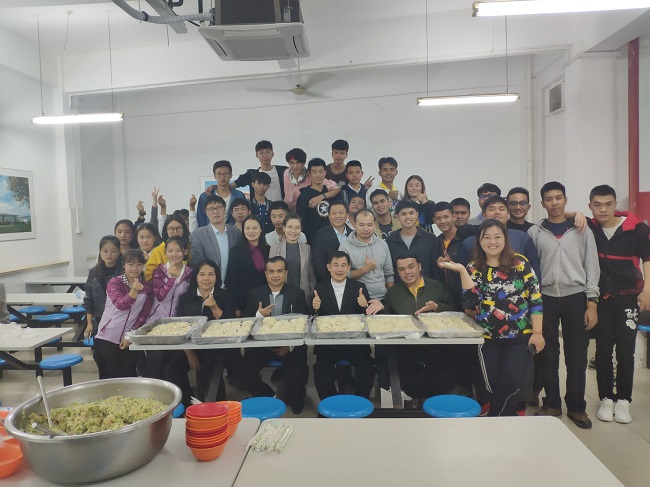 2018年11月25日下午,365官网机械与能源工程学院、团委、后勤保障处共同组织了泰国交流师生在生活园区食堂举办的以“情系中华,崭露‘头饺’”为主题的文化交流联谊活动,本次活动旨在体验中国传统美食文化。机械与能源工程学院院长方林中、机械与能源工程学院党总支副书记何永艳、机械与能源工程学院副院长陈永平、校团委副书记熊武、校团委委员、机械与能源工程学院团总支书记杨洋以及全体辅导员老师和部分师生代表共同参加了活动。