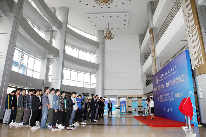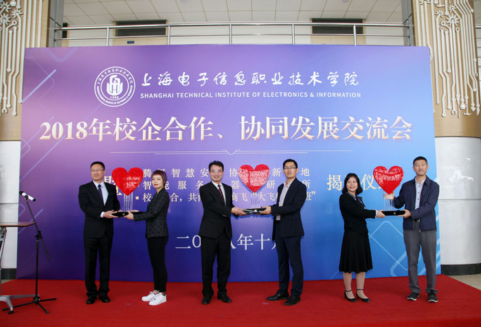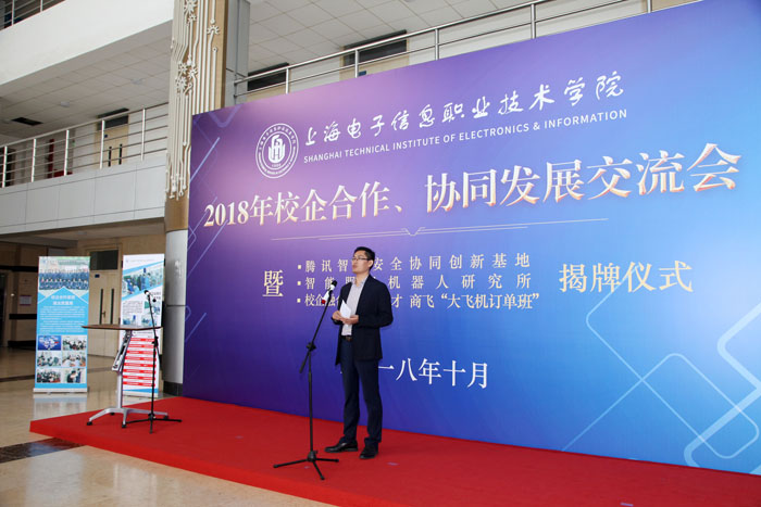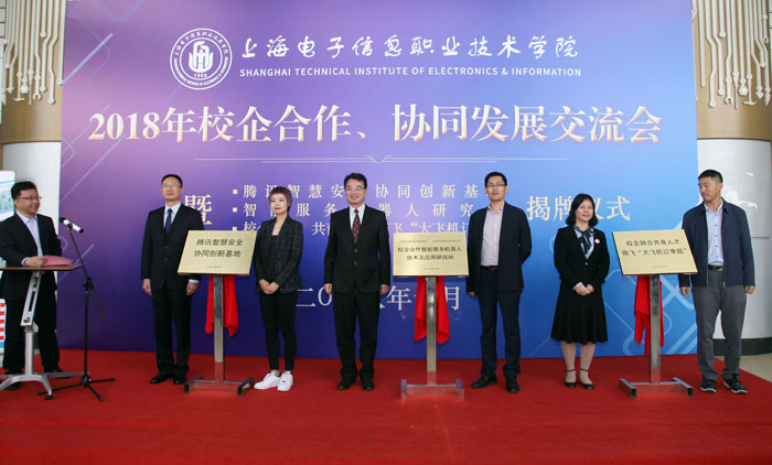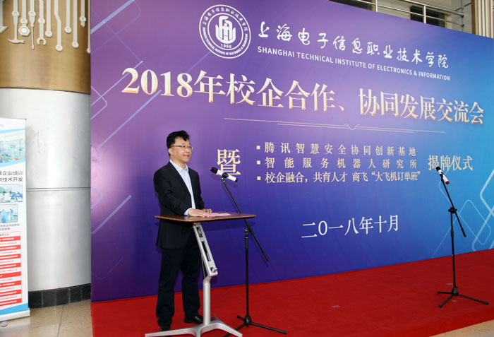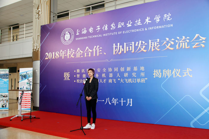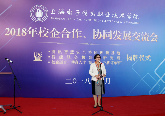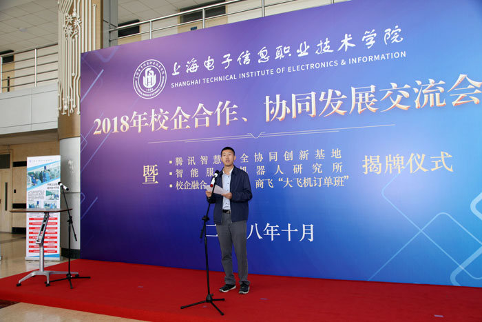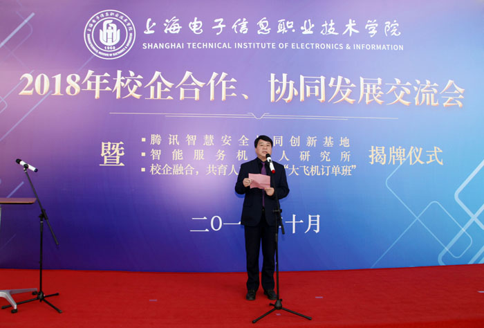 10月26日上午,上海电子信息职业技术学院2018年校企合作、协同发展交流会暨腾讯智慧安全协同创新基地、智能服务机器人研究所、校企融合,共育人才——商飞“大飞机订单班”揭牌仪式在奉贤校区实训中心N楼一楼大厅隆重举行。中国商飞上海飞机制造有限公司、腾讯公司、中国人工智能学会、浙江大学、上海交通大学、上海天辰智能科技有限公司等单位的领导和专家,学校党委书记田钦,党委副书记、校长杨秀英,党委副书记、副校长顾剑锋,副校长窦争妍、副校长张涛,以及各二级学院的领导出席会议。会议由校企合作处处长李晓峰主持,商飞“大飞机订单班”学生以及中德工程学院留学生代表共同见证了此次活动。