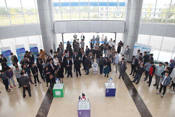 最后的嘉宾交流环节,与会来宾一起观摩了由学校机械与能源工程学院、通信与信息工程学院、上海电子工业学校联合献上的智能服务机器人演示与互动。智能服务机器人与来宾交互对话,各展所长,不断为来宾制造惊喜,现场气氛十分热烈。(作者:陈依文 文/傅娟 图 供稿单位:校企合作处)
