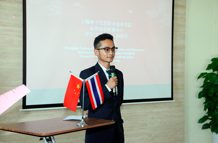 泰国学生代表发伊作学生工业机器人训练营汇报,表示他和同学们为能够参加训练营感到骄傲和自豪,训练营丰富的课程、参观实践和文化体验,让他们收获满满、记忆深刻,感谢上海电子信息职业技术学院的老师和同学们的热情帮助,也感谢项目各方付出的努力。在发伊同学的提议下,训练营全体学员以泰国合十礼致谢,并祝愿双方缔结的友谊长青。