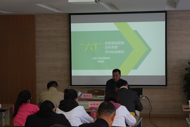 11月9日,上海大学后勤集团副总张燕灵主讲了推行“六T”管理提升服务质量,详细解读了六T的相关知识及评分标准。之后还去食堂进行了“六T”管理现场指导。