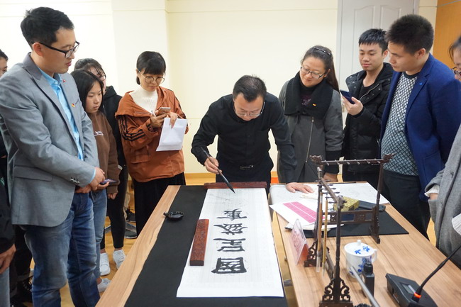 为贯彻中共中央、国务院《关于全面深化新时代教师队伍建设改革的意见》文件精神,落实全国教育大会精神,弘扬社会主义核心价值观和中华优秀传统文化,加强广大教工教学基本功训练和师德师风建设,提升教师的文字功底和综合素质。11月16日下午,由学校团委主办,综合管理教工团支部、综合管理分工会联合承办的“夯实教师基本功,传承中华传统文化” 青年教工主题团日活动在A207顺利举办。活动当天,学校团委特邀请到书法家、上海市书法家协会会员、上海青年书法家协会会员华志高先生给学校教职工带来了“夯实教师基本功,传承中华传统文化”书法艺术大讲堂。学校分管副校长张涛、团委、各教工团支部青年教师代表及学校书法社学生代表共同参加了此次活动。