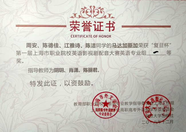 2018年12月14日,外语学院组织学生赴上海工商外国语学校,参加“‘复旦杯’第一届上海市职业院校英语影视剧配音大赛”。经过五个小时的比赛,公共英语组的乔瀚莹、杨亦泽、黄云杰、潘志航、孟丹五位同学的《灰姑娘》荣获公共英语组一等奖;周安、江雅诗、陈德佳、陈洁同学的《马达加斯加》荣获英语专业组一等奖。