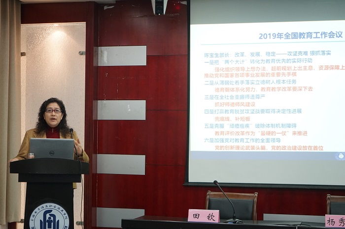 学校党委副书记、校长杨秀英与大家沟通了2019年行政工作设想。杨校长首先介绍了2019年全国教育工作会议内容,为学校2019年工作定下基调。随后,她从坚持立德树人根本,提升师队建设质量;深化教育教学改革,完善质量保障体系;渗透创新创业教育,深化国际合作内涵;提升科研技术水平,增强社会服务能力;坚持依法依规办学,创新校企合作机制;提升管理服务水平,建设美丽和谐校园等方面,对学校2019年行政工作作出安排。她指出要切实推动学校内涵发展,围绕学院“十三五”事业发展规划,持续深化综合改革,优化质量保障,推进依法治校,创新运行机制,完善内控管理,全面推动学校人才培养事业发展。
