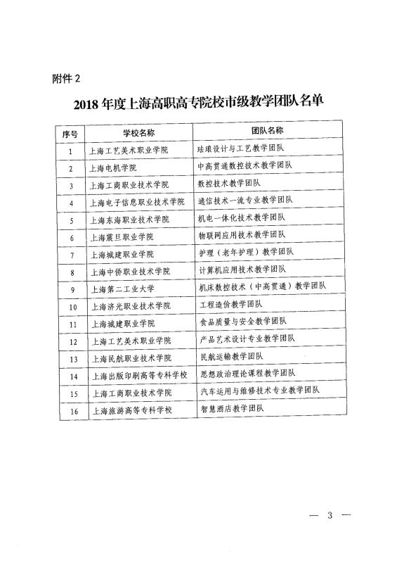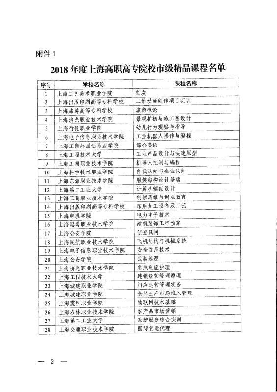 2019年1月21日,根据《上海市教育委员会关于公布2018年度上海高职高专院校市级精品课程、教学团队名单的通知》(沪教委高〔2019〕5号),上海市教育委员会授予365官网《工业机器人操作与编程》《安全防范技术》2门课程为“2018年度上海高职高专院校市级精品课程”,“通信技术一流专业教学团队”为“2018年度上海高职高专院校市级教学团队”。