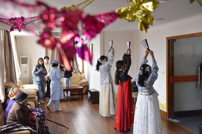 此次活动分为两队人马,第一小分队在活动室为老人表演精心准备的节目,总共表演了四个节目,这四个节目不仅为了给老人们解闷,也体现了社会主义核心价值观内涵。其中汉服舞深受老年人的喜爱,节目表演完老人都露出了笑脸,老人们和同学们都纷纷的鼓起了掌,这是一段愉快的时间。第二队人在三楼分别为老人画肖像,陪老人聊天,细心地询问老人的生活状况,听老人讲讲过去,讨论一下现在,不仅使老人摆脱了寂寞,也使自己受到了教育。志愿者活动很快过去,大家合影留念,同学们与老人们纷纷告别,同学们表示一定会进一步发扬志愿者精神,提高自己的志愿者服务水平。