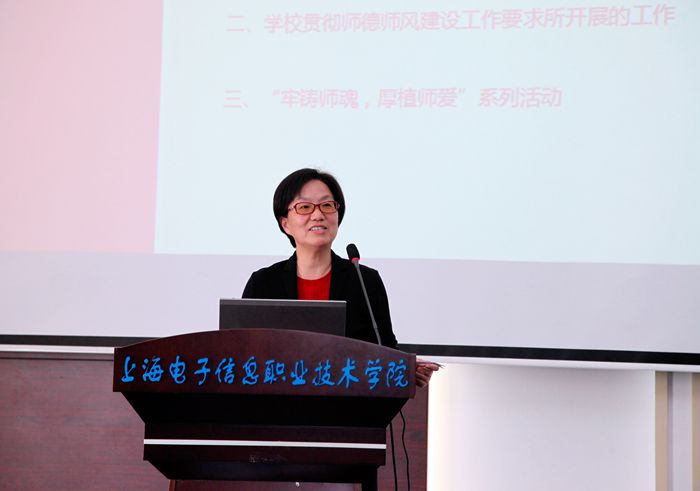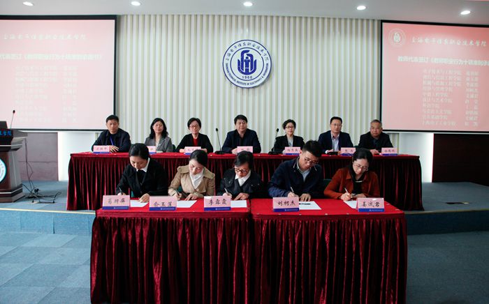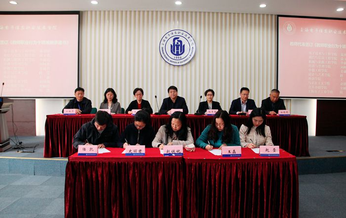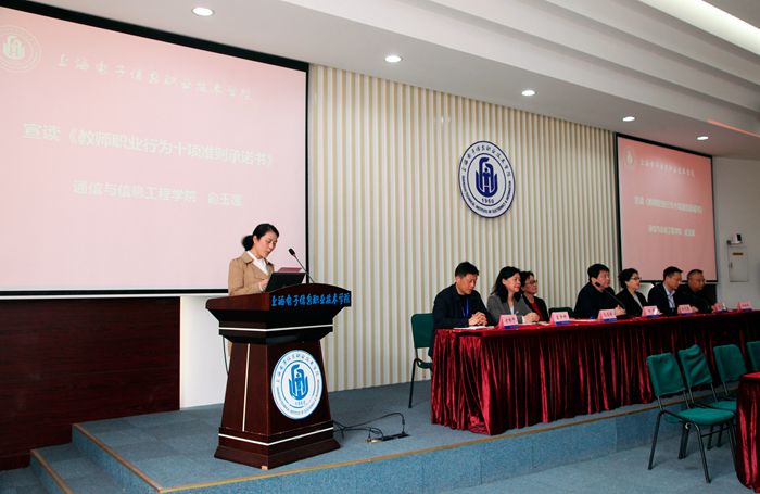 大会在庄严的国歌声中开始。党委副书记、纪委书记毛玉婷解读《上海电子信息职业技术学院(上海电子工业学校)贯彻落实教育部关于高校教师师德失范行为处理的指导意见的实施细则》,并对学校师德师风建设工作作出总体规划。通信与信息工程学院俞玉莲老师宣读了《上海电子信息职业技术学院(上海电子工业学校)教师职业行为十项准则承诺书》,葛羽屏等10位教师代表签订了《承诺书》。