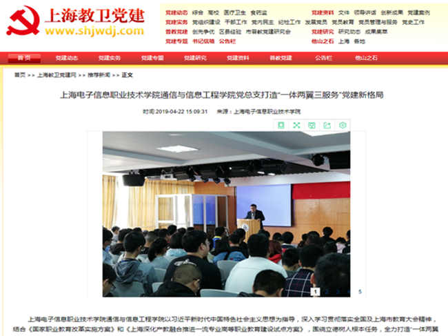 上海电子信息职业技术学院通信与信息工程学院以习近平新时代中国特色社会主义思想为指导,深入学习贯彻落实全国及上海市教育大会精神,结合《国家职业教育改革实施方案》和《上海深化产教融合推进一流专业高等职业教育建设试点方案》,围绕立德树人根本任务,全力打造“一体两翼三服务”党建新格局。上海基层党建网、上海教卫党建网均进行了报道。