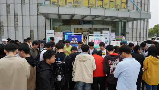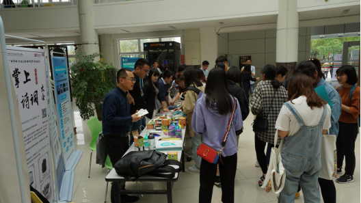 一楼大厅外,一支由图书馆老师带领的宣传小分队,以语言文字、益智类小游戏“生僻字大作战”、“单词闯关”、“百科知识竞赛”等趣味游戏形式吸引同学们关注图书馆微信公众号并参与读书节活动。