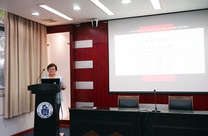 会上,与会领导和学员们观看了中德师培项目国内培训视频。2019年中德师培项目电子组、机械制造组、数控技术组、商贸旅游组学员代表分别介绍了国内培训阶段的学习、企业实践培训情况和感想体会,主要包括转变教育教学理念、提升专业实践能力、扩展校企合作路径、探索产教融合机制等方面。学员们纷纷表示,学到的不仅仅是理论和技术层面的知识,更重要的是取得了教学理念的突破、重构课程教学内容能力的突破、实践能力的突破。2018年中德师培项目组学员代表、团长分别作了德国培训、培训团总结汇报,对探索德国职业教育“双元制”中国本土化创新、职业教师培养、技术技能人才培养、搭建平台推广培训项目经验和影响进行了思考和总结。