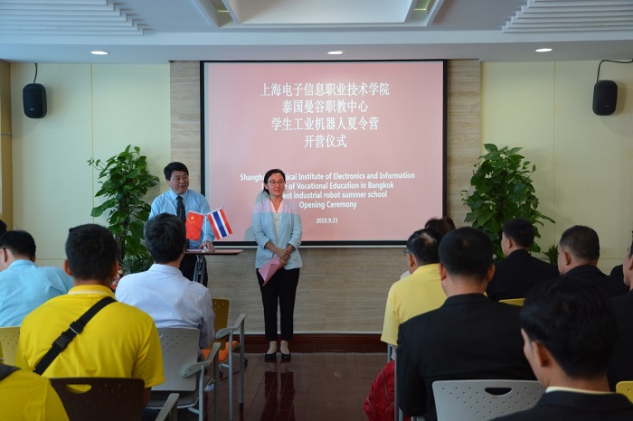 2019年9月23日,上海电子信息职业技术学院与泰国曼谷职教中心合作的学生工业机器人夏令营开营。上海电子信息职业技术学院党委书记田钦、党委副书记、校长杨秀英、党委副书记、纪委书记毛玉婷、党委副书记、副校长张涛、副校长窦争妍、副校长徐德明、副校长方林中,中德工程学院院长林军、机械与能源工程学院副院长陈永平、国际交流处副处长邱娟对30名远道而来的泰国师生表示热烈欢迎,并参加了开营仪式。