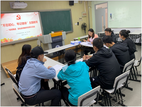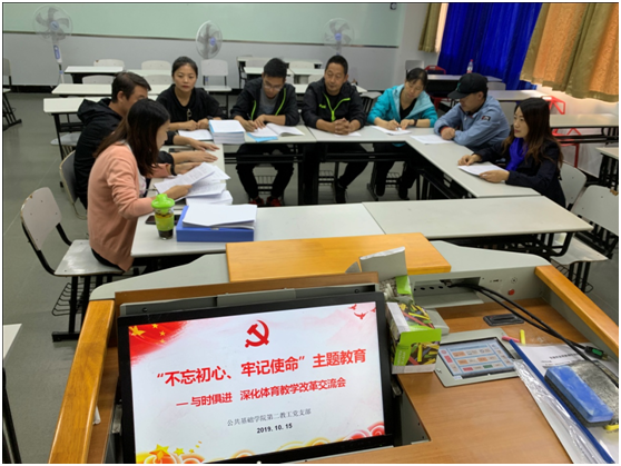 2019年10月15日,公共基础学院第二党支部在奉贤校区D202会议室召开“不忘初心,牢记使命”主题教育——与时俱进深化体育教学改革交流会,会议由基础学院第二党支部书记王春丽主持,全体党员参加。