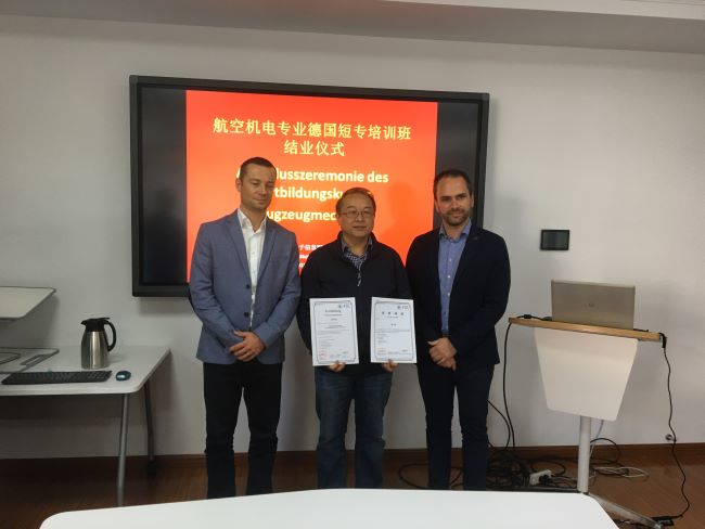 航空机电专业教学德国专家短期培训班于2019年10月28日~2019年11月1日在中德工程学院圆满完成,德国巴伐利亚州奥古斯堡第一职业学校两位德国专家Stefan Lechner和RobertStubenrauch为中德工程学院航空维修工程系教师进行培训。