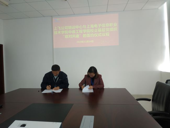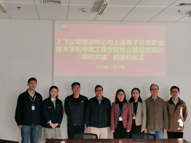 2019年11月14日上飞公司浦东基地B26新实训中心,中德工程学院与上飞公司培训中心举办了校企基层党组织“结对共建”签约仪式。出席仪式的有:中德工程学院党总支书记张峻颖、副院长黄婷婷、上飞公司副总经济师兼综合管理党总支书记宋启明、培训中心主任郭家宁、党委工作部副部长骆黎佳、中德航空维修工程系主任孟秋静、教研室主任陈杰菁等。