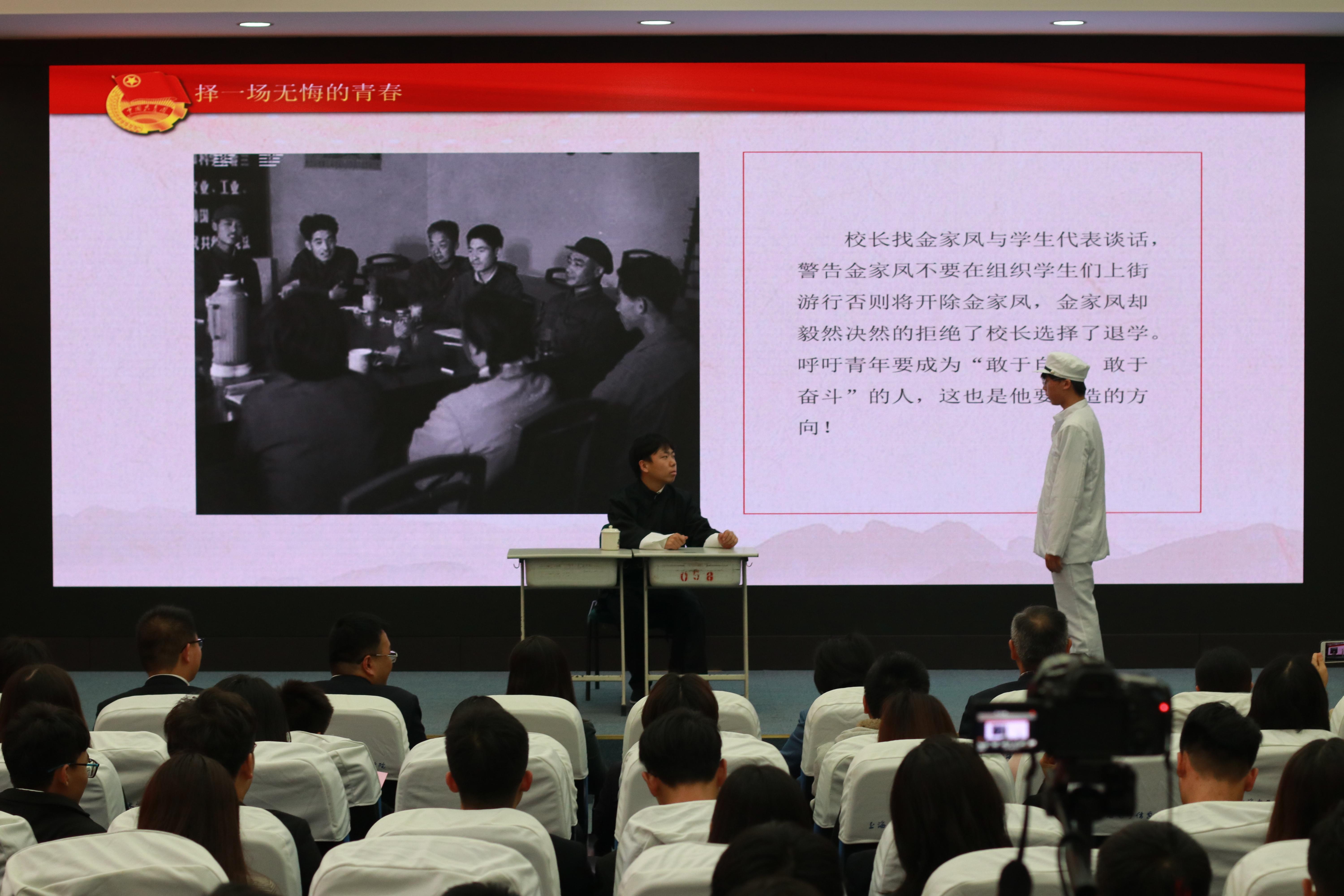 会议上,两组学员代表进行了情景教学的成果汇报演出,《金家凤——择一场无悔的青春》讲述上海社会主义青年团发起人之一17岁的金家凤,帮助《新青年》杂志筹办筹措资金,为国家命运振臂高呼的感染故事。《刘少奇——学霸室友》讲述22岁的刘少奇在上海追求真理,一往无前,不断地把新思想传入国内,成为推动革命的中坚力量的故事。