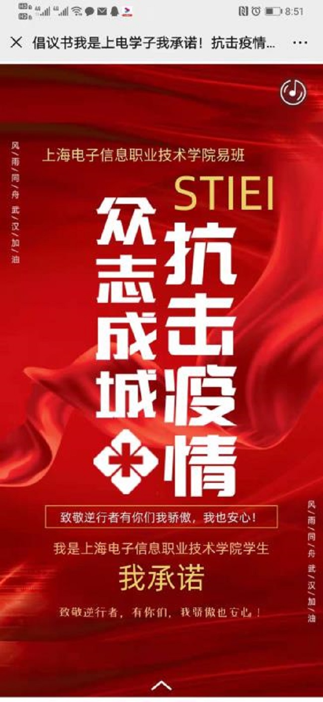 精准排摸、上传下达、教育指导、关怀帮扶、心理辅导、舆情引导……手机成为“武器”,文字充满温暖,话语给人力量,学工队伍全面打响了疫情防控的“信息战”。同学们积极参与,一幅写着“如果有学生干部、班主任、辅导员不分时间段的询问您的情况,请您积极配合他们的工作,为了控制疫情,他们舍弃了与家人团聚和休息的时间,在不分昼夜的默默付出,让我们一起努力!”的图片在同学们朋友圈里刷屏。学校易班发展中心发起“众志成城,抗击疫情——我是上海电子信息职业技术学院,我承诺”线上接力活动一天内吸引了近千名同学参加接力。这个寒假,我们心在一起。