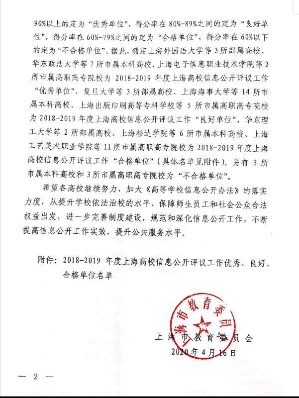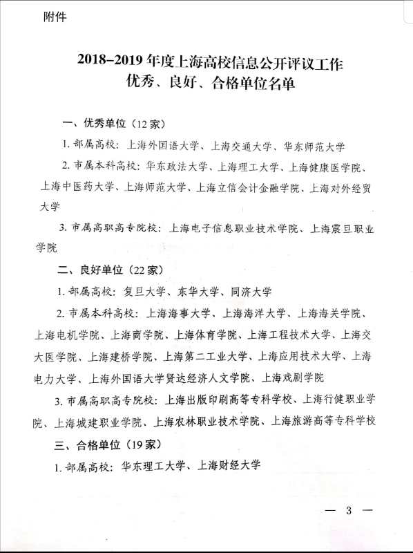 近日,上海市教委发布《上海市教育委员会关于公布2018-2019年度上海高校信息公开评议结果的通知》(沪教委办〔2020〕16号),365官网获评2018-2019年度上海高校信息公开评议工作优秀单位。 学校将继续加大《高等学校信息公开办法》的落实力度,进一步完善学校制度、规范,深化信息公开工作,不断提高信息公开工作实效,提升依法治校水平,保障师生员工合法权益,提升公共服务水平。(作者:李夏 供稿单位:校办)