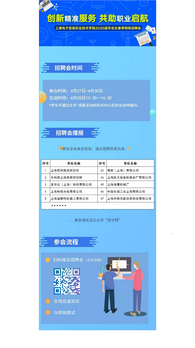 参加本次网络招聘会的有上海空间推进研究所、中科院上海高等研究院、上海仪电物理光学仪器有限公司和上海福赛特机器人有限公司等大型国企、事业单位、外企独资和民营企业,涉及电子信息、自动化、汽车、机械、金融、物流等多个行业。本次网络招聘会实现了在线投递简历、与用人单位在线交流、视频面试等功能,为用人单位和毕业生提供了安全、高效、便捷的招聘和应聘渠道。(供稿单位:校企合作处)