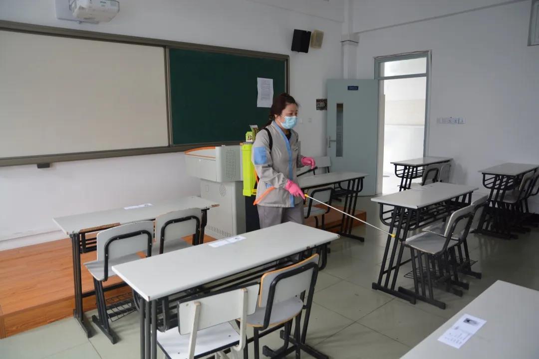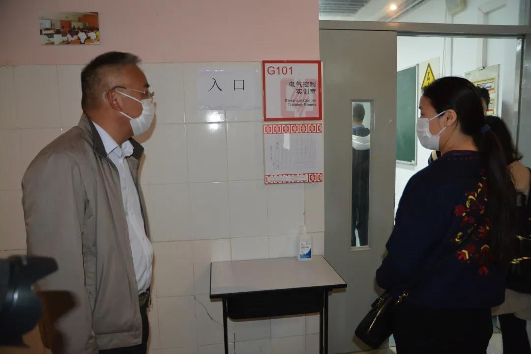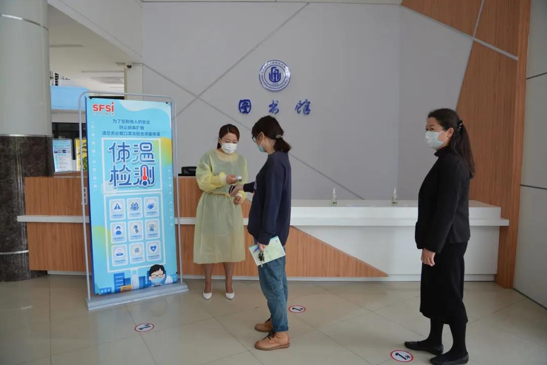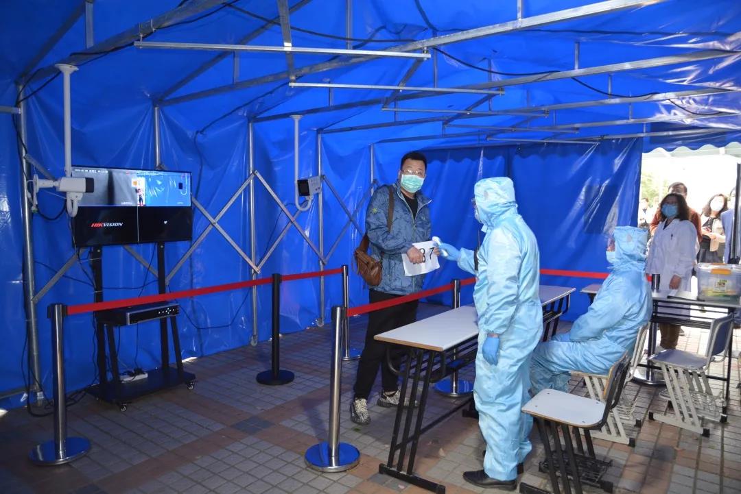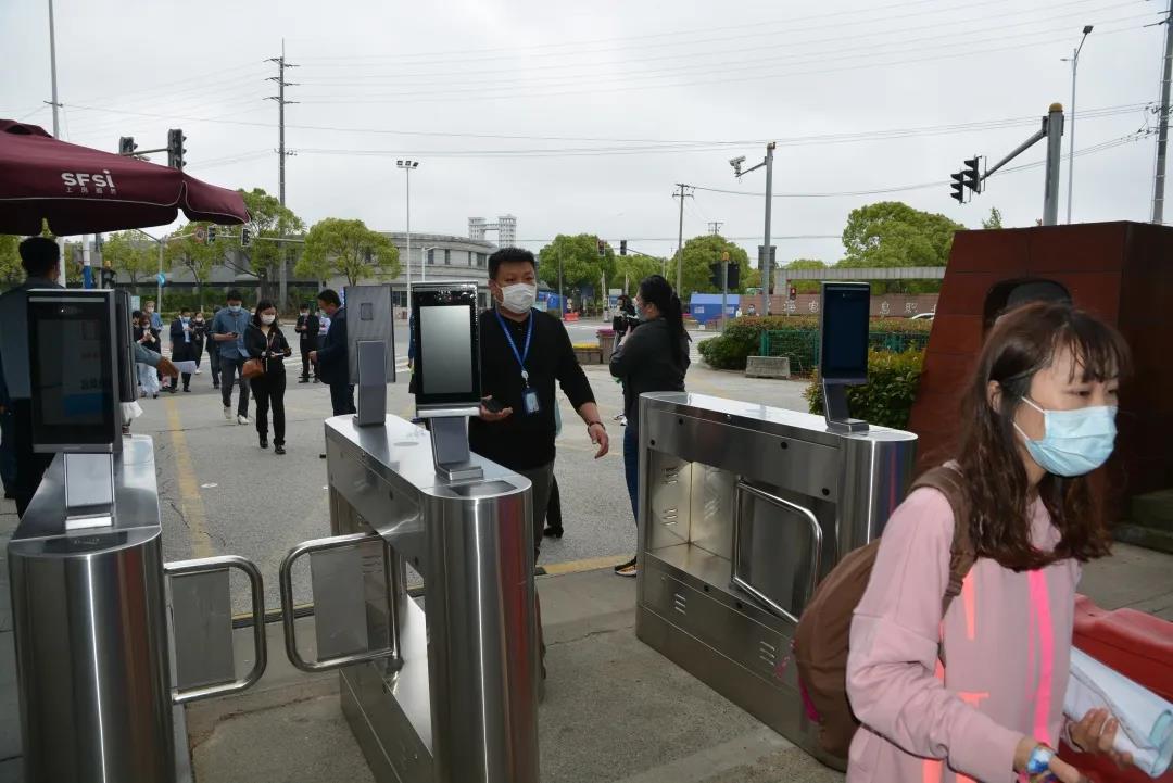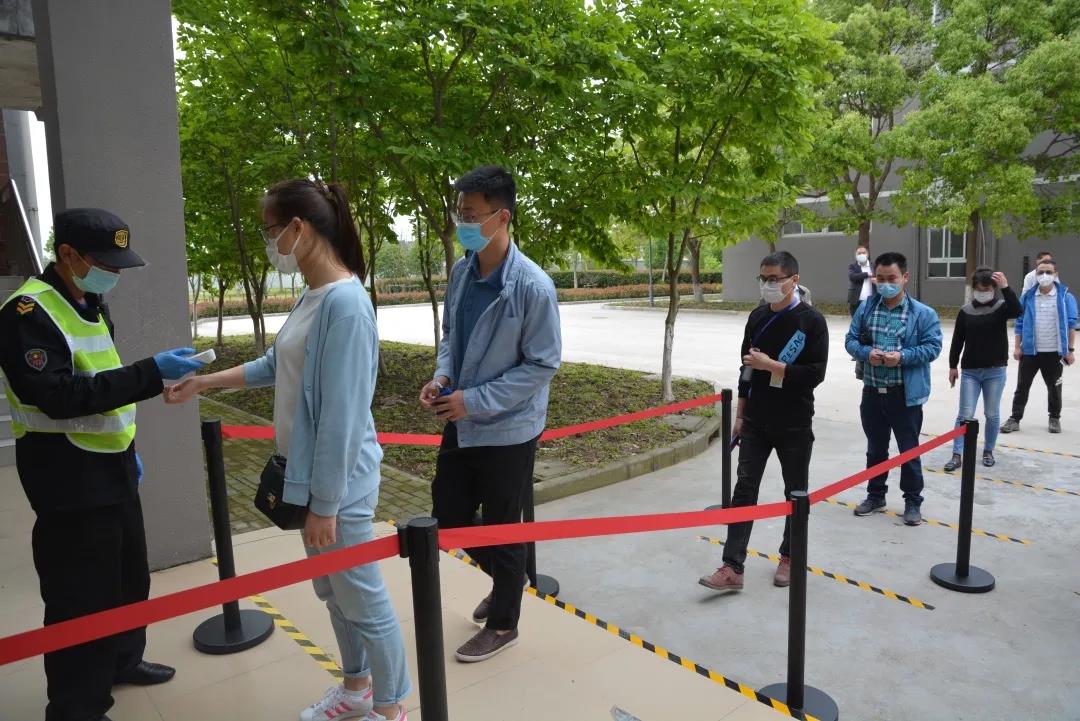 9:00,参加复学演练的教职工开始乘班车或自行开车入校。党委书记田钦、党委副书记、校长杨秀英等全体校领导、相关职能部门工作人员已早早守候在校门口。工作人员细心检测入校人员体温和口罩佩戴情况,教职工们佩戴口罩,在黄色警戒线上保持一米间距,持“绿色”健康码接受查验,通过热成像测温通道有序进入校园。