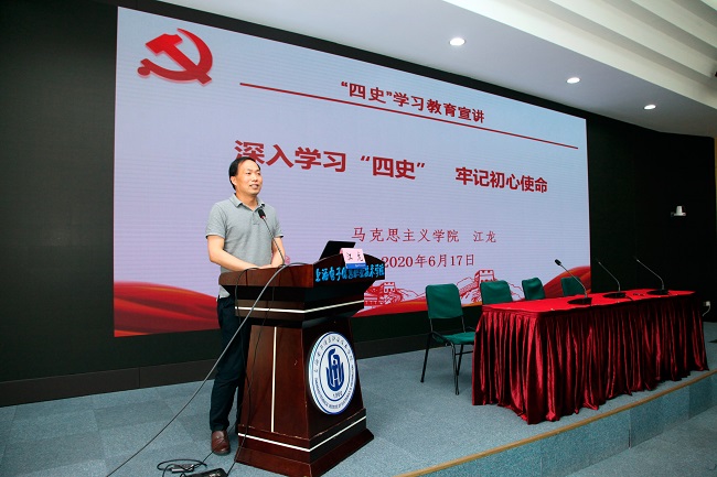 马克思主义学院党支部副书记江龙以“深入学习‘四史’,牢记初心使命”为题,明晰了学习“四史”的目标任务,对只有社会主义才能救中国、没有共产党就没有新中国、只有改革开放才能发展中国、只有坚持和发展中国特色社会主义才能实现中华民族伟大复兴等四个方面作了专题宣讲。