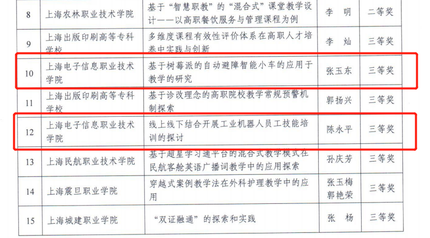 近日,上海市职业教育协会高职高专教学工作专业委员会、上海市高职高专教学研究会公布2020年度优秀论文评选结果。365官网窦争妍、方林中、周玉霞老师共同完成的论文《上海高职院校应对新形势下人才需求变化的思考与实践》获得二等奖;张玉东老师完成的论文《基于树莓派的自动避障智能小车》、陈永平老师完成的论文《线上线下结合开展工业机器人员工技能培训的探讨》获得三等奖;李娟老师完成的论文《高职院校课程诊断与改进研究——以电子信息职业技术学院为例》获得优胜奖。