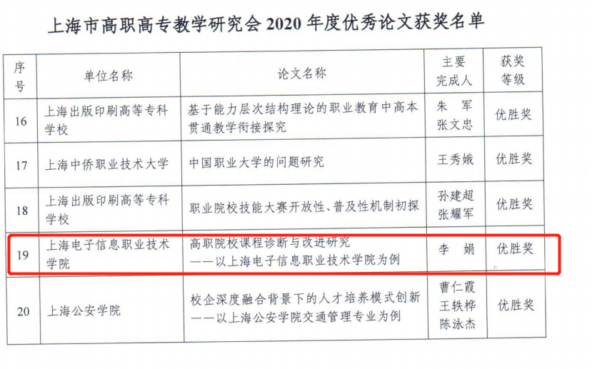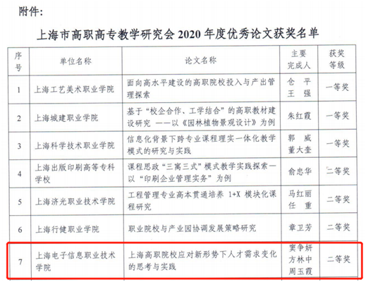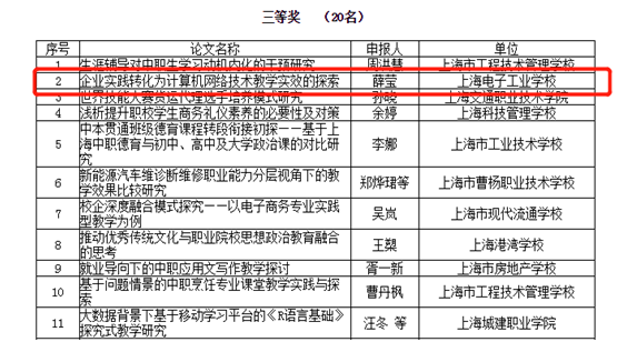 另外,在上海市职业教育协会公布的第十五届优秀论文评选结果中,365官网薛莹老师完成的论文《企业实践转化为计算机网络技术教学实效的探索》获得三等奖。(供稿单位:科研处)