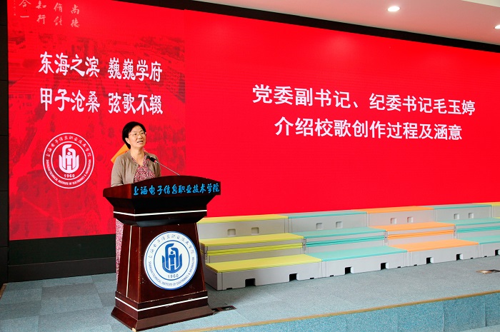 “阳光十月,东海之滨,白鹭飞舞,展翅长空。”发布活动中,栾文飞、杨奇两位老师朗诵了校歌歌词《美好的创造》。接着,党委副书记、纪委书记毛玉婷发布校歌《美好的创造》,介绍了校歌创作缘由、过程和词曲作者,她表示,校歌创作过程是一个厚积薄发的过程,也是一个着眼未来的过程。毛玉婷副书记对为校歌创作而倾情付出的领导、老师、专家表示衷心感谢,深情寄语:让校歌唱响在每个有电子信息人的地方,让“自强不息,开拓创新,砥砺前行,追求卓越”的学校精神通过校歌远播四方,鼓舞师生、校友、社会英才矢志不渝传承工匠精神,做新时代奋斗者,为实现中华民族伟大复兴而俯首为学,奋起追梦!