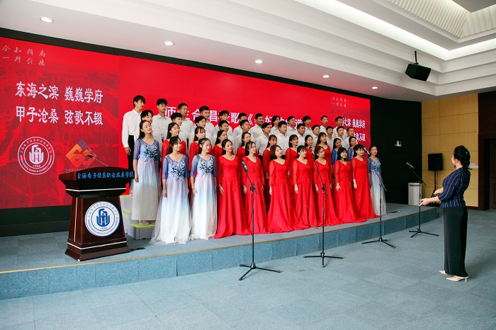 “校园石上铭刻初心,毕业林中写满深情。职业的摇篮,技术的未来,矢志不渝青春梦想成真。”大学生艺术团在常浠婧老师的指挥下,为大家献上了精彩的校歌大合唱。悠扬的旋律响起,感染师生回望历史,重温栉风沐雨而又激情豪迈的光辉岁月;看见当下,感受为之奋斗的育人事业、为之欢欣的成才之路,爱校情、报国志从心头涌起,澎湃不息。