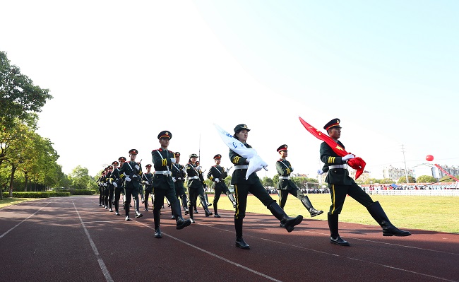 上午九时半,典礼正式开始。伴随着雄壮激昂的国歌声,鲜艳的五星红旗冉冉升起,全场起立,高唱国歌,现场气氛庄严、神圣。随之,举行升校旗、奏唱校歌仪式。