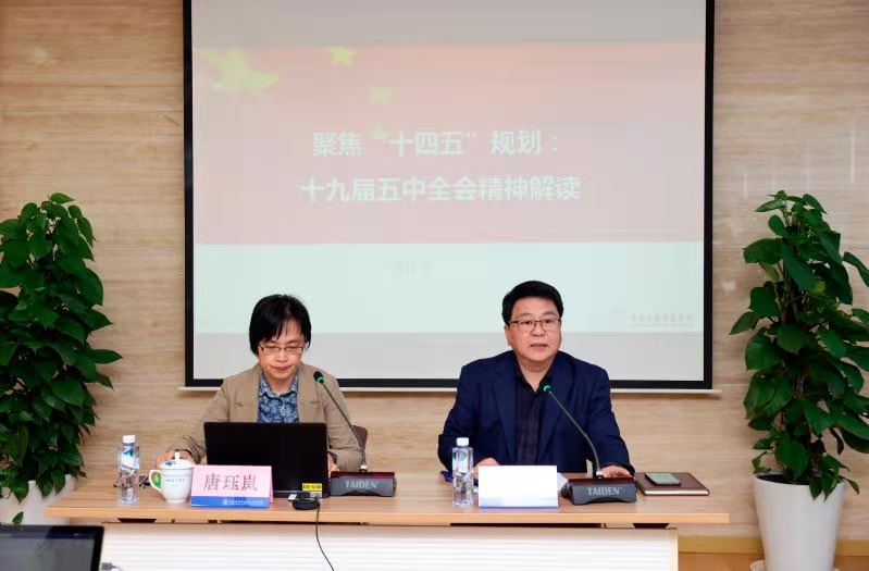 11月5日,学校在A207会议室举行党委理论学习中心组学习会,学习贯彻党的十九届五中全会精神。中共上海市委党校经济学教研部主任、理论经济学研究所所长、上海市经济学会副秘书长唐珏岚教授应邀作了题为《聚焦“十四五”规划:十九届五中全会精神解读》专题辅导报告。党委书记田钦主持学习会。学校党政领导、各部门党政负责人参加学习。