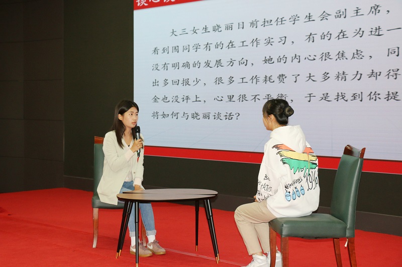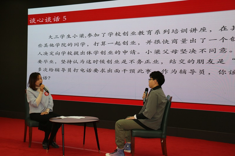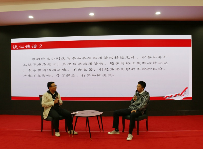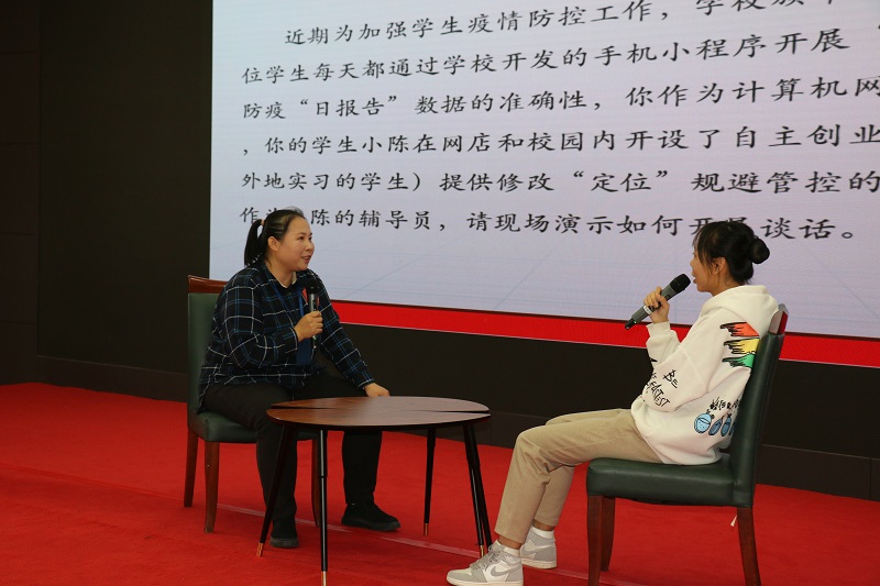 决赛包括工作自评报告和现场展示两部分内容。其中,现场展示分为谈心谈话、“四史”学习教育宣讲两个环节。现场展示第一环节中,8位选手根据抽签顺序,现场取题、即兴分析,以情景再现的方式开展谈心谈话,考察辅导员在与学生谈话中的沟通技巧和思维能力。参赛选手们沉着应对,冷静作答,尽展风采。学生“演员”们的精彩演出,引得现场观众笑声连连、掌声不断。第二环节中,选手们结合亲身经历、日常工作等,就“四史”学习教育进行了宣传阐释。参赛辅导员各自选取切入点,思路清晰、深入浅出,表现了扎实的理论功底和过硬的文化素养,展现出365官网辅导员的风采和水平,得到了评委们的一致赞赏。
