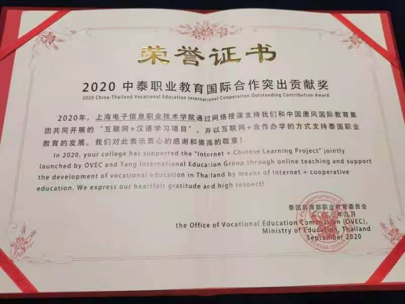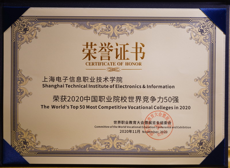 17日,在2020(第二届)中德职业教育国际产教融合研讨会上,上海电子信息职业技术学院获得“中德职业技术教育网对德合作试点示范单位”、“中德职业教育与产教融合合作示范项目”荣誉。学校提交的案例《德国高等职业教育在中国的融合与贯通》入选《2020第五届世界职业教育大会国际合作优秀案例汇编》。