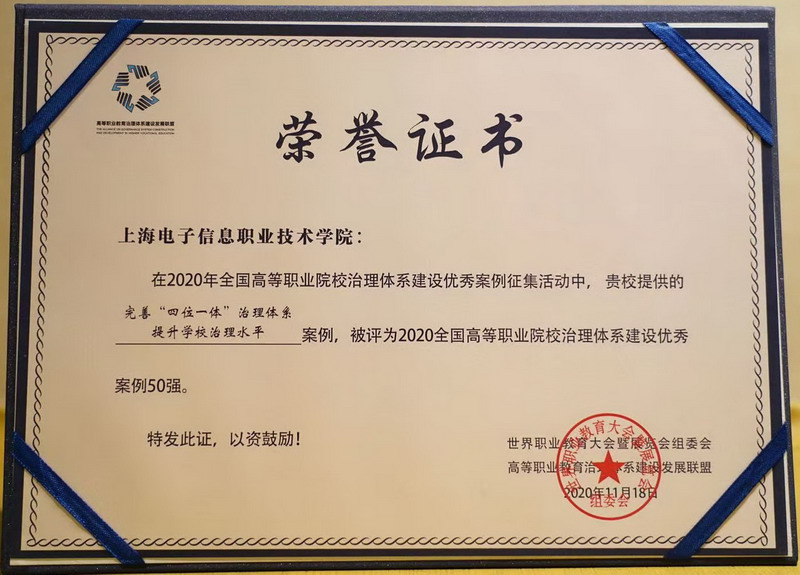 在2020高等职业院校治理体系建设交流研讨会上,上海电子信息职业技术学院提交的《完善“四位一体”治理体系 提升学校治理水平》被评为2020全国高等职业院校治理体系建设优秀案例50强。