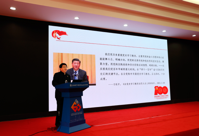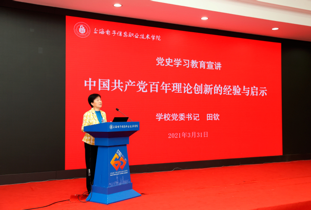 3月31日,学校党史学习教育宣讲第一讲在C108报告厅拉开序幕。校党委书记、校党史学习教育领导小组组长田钦率先作《中国共产党百年理论创新的经验与启示》宣讲报告会。学校全体中层干部、二级单位党组织书记、组织员及党员教师代表参加宣讲会。宣讲会由校党委副书记、纪委书记、校党史学习教育领导小组副组长毛玉婷主持。