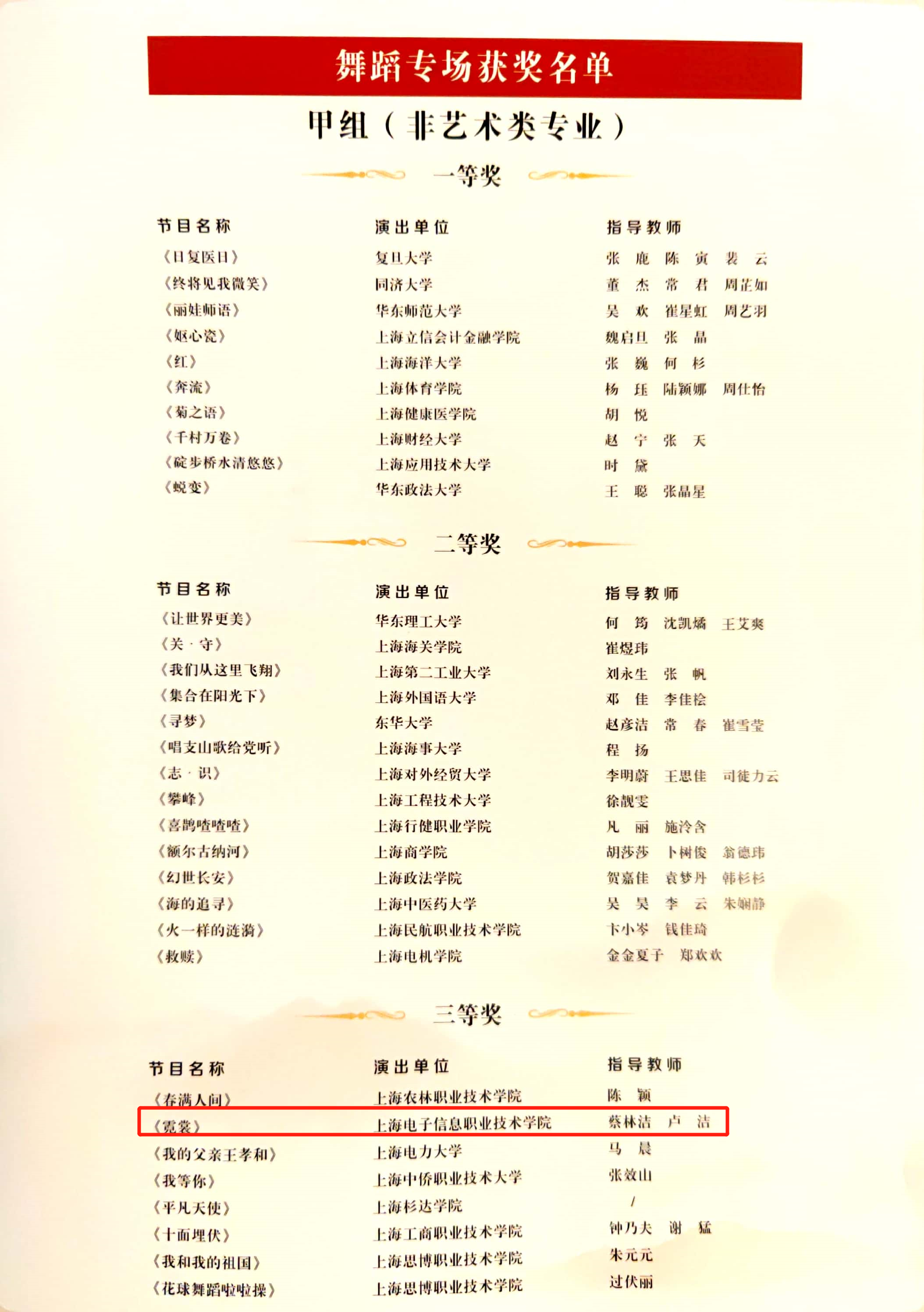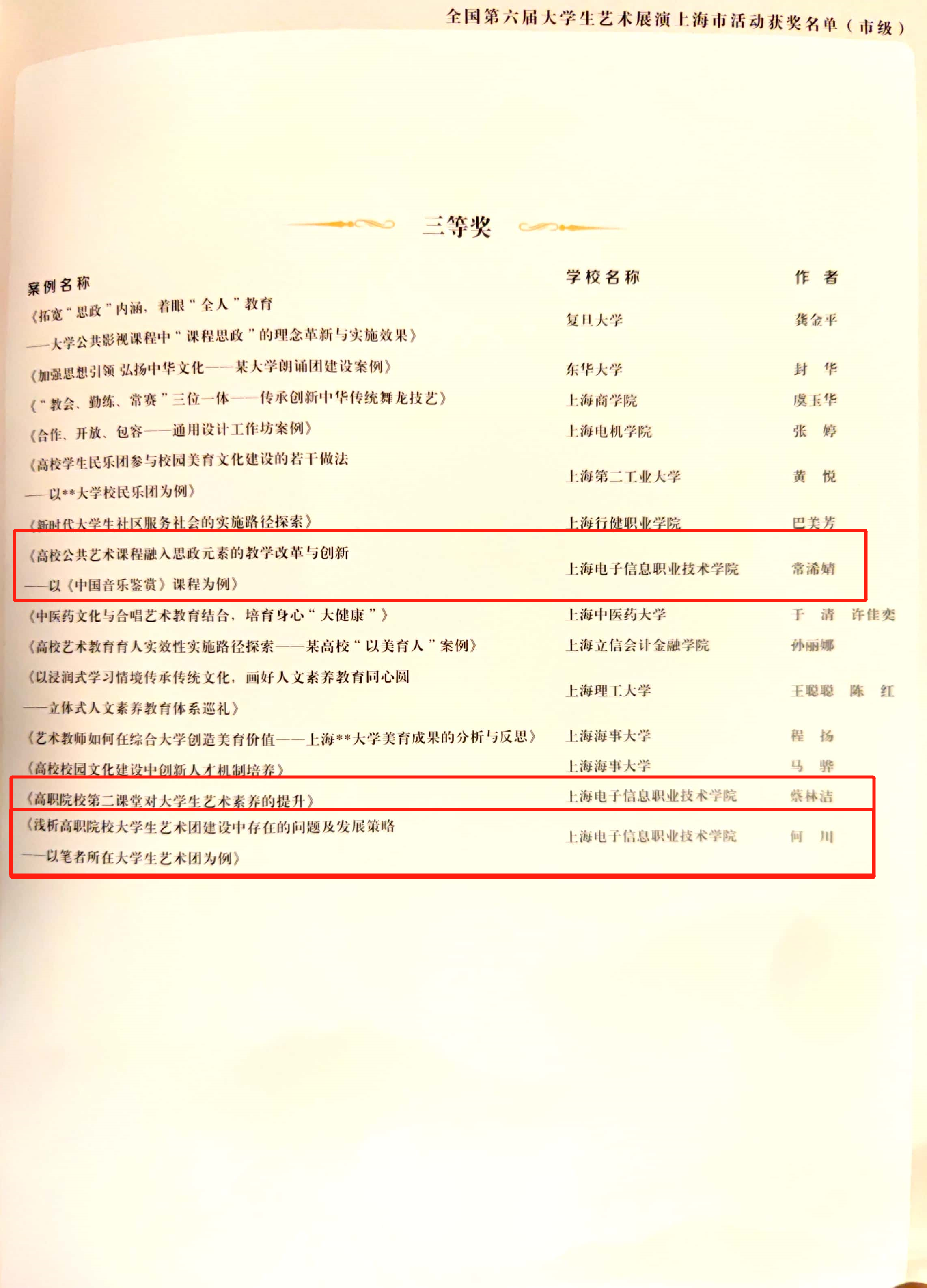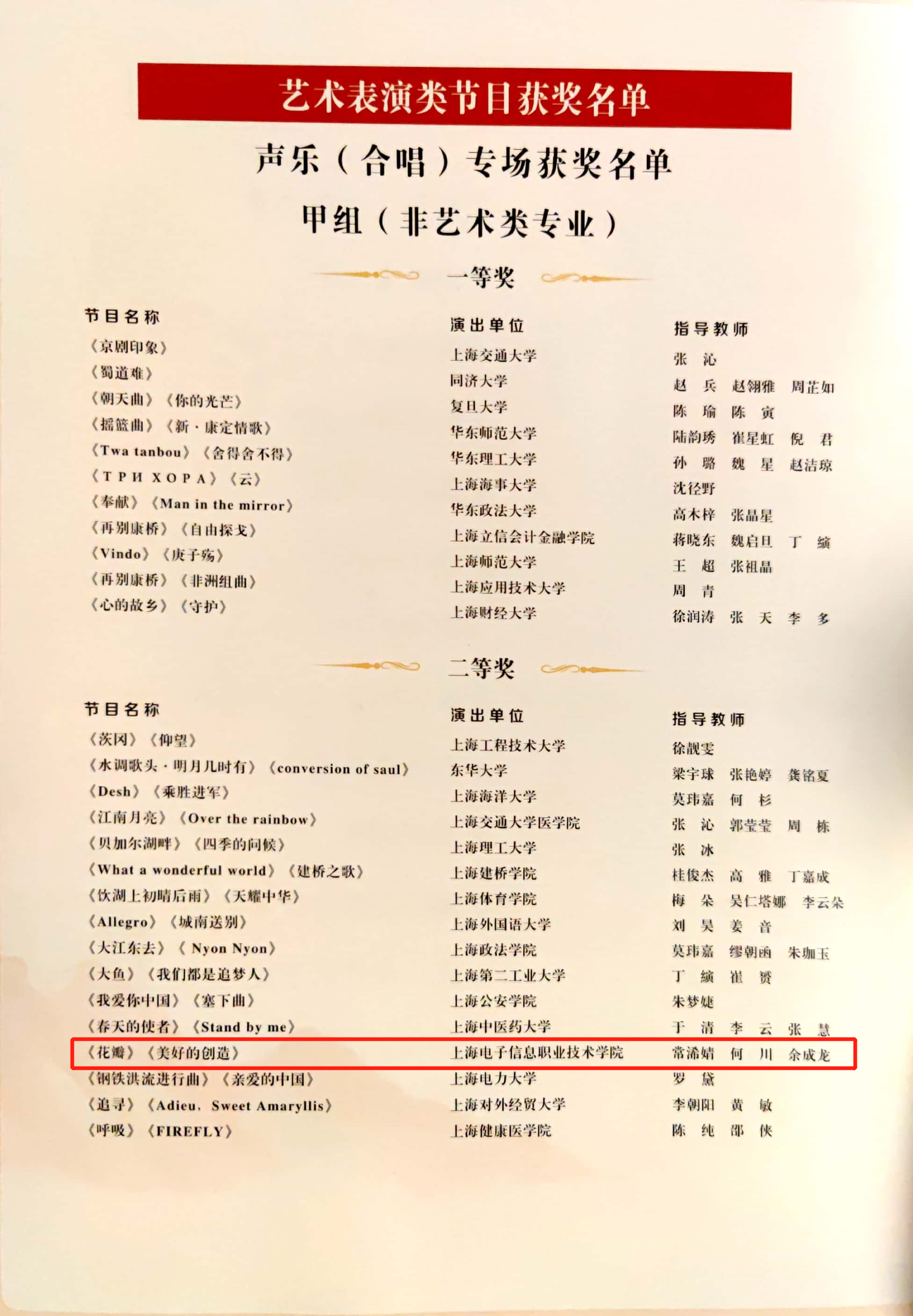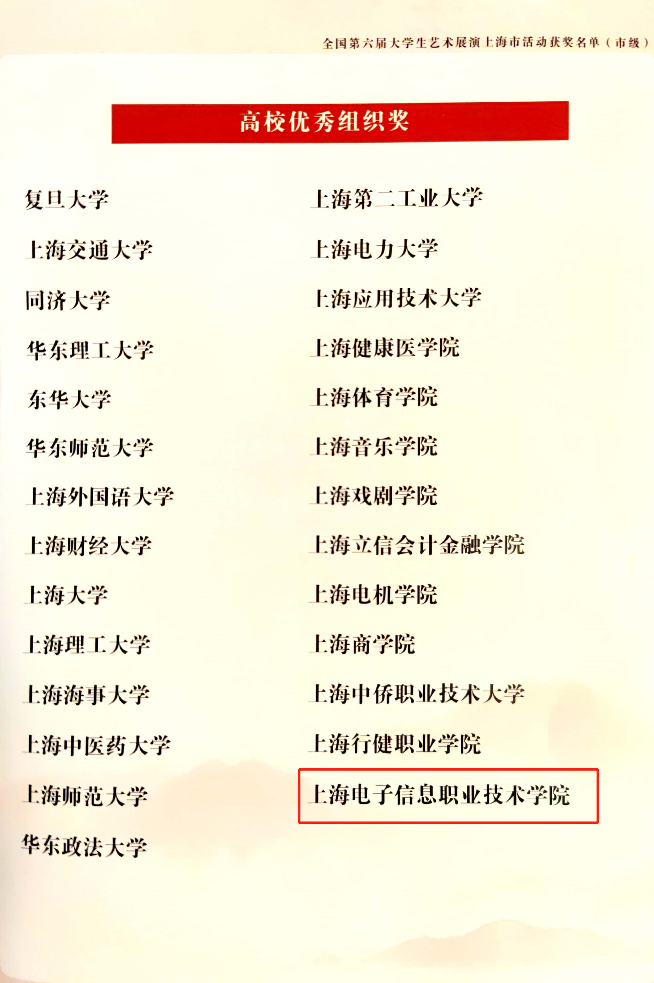 近日,上海市教育委员会公布了第六届全国大学生艺术展演上海赛区活动获奖名单。365官网共荣获11个奖项,在上海高职院校中名列前茅。其中,获得高校优秀组织奖1个、“校长风采奖”1个、其他艺术表演及设计类二等奖2个、三等奖7个。