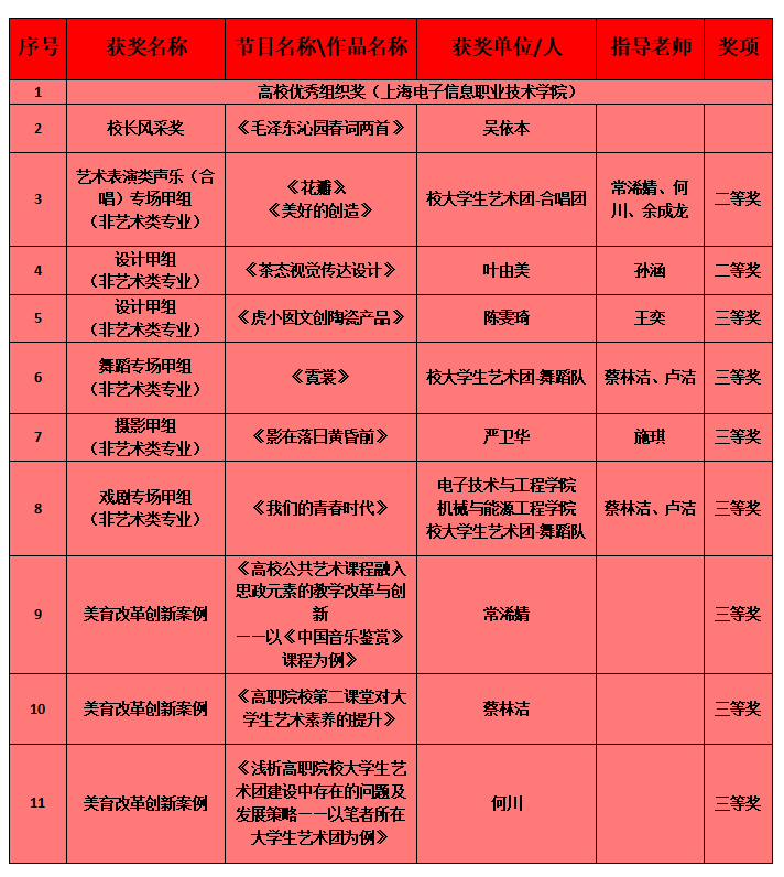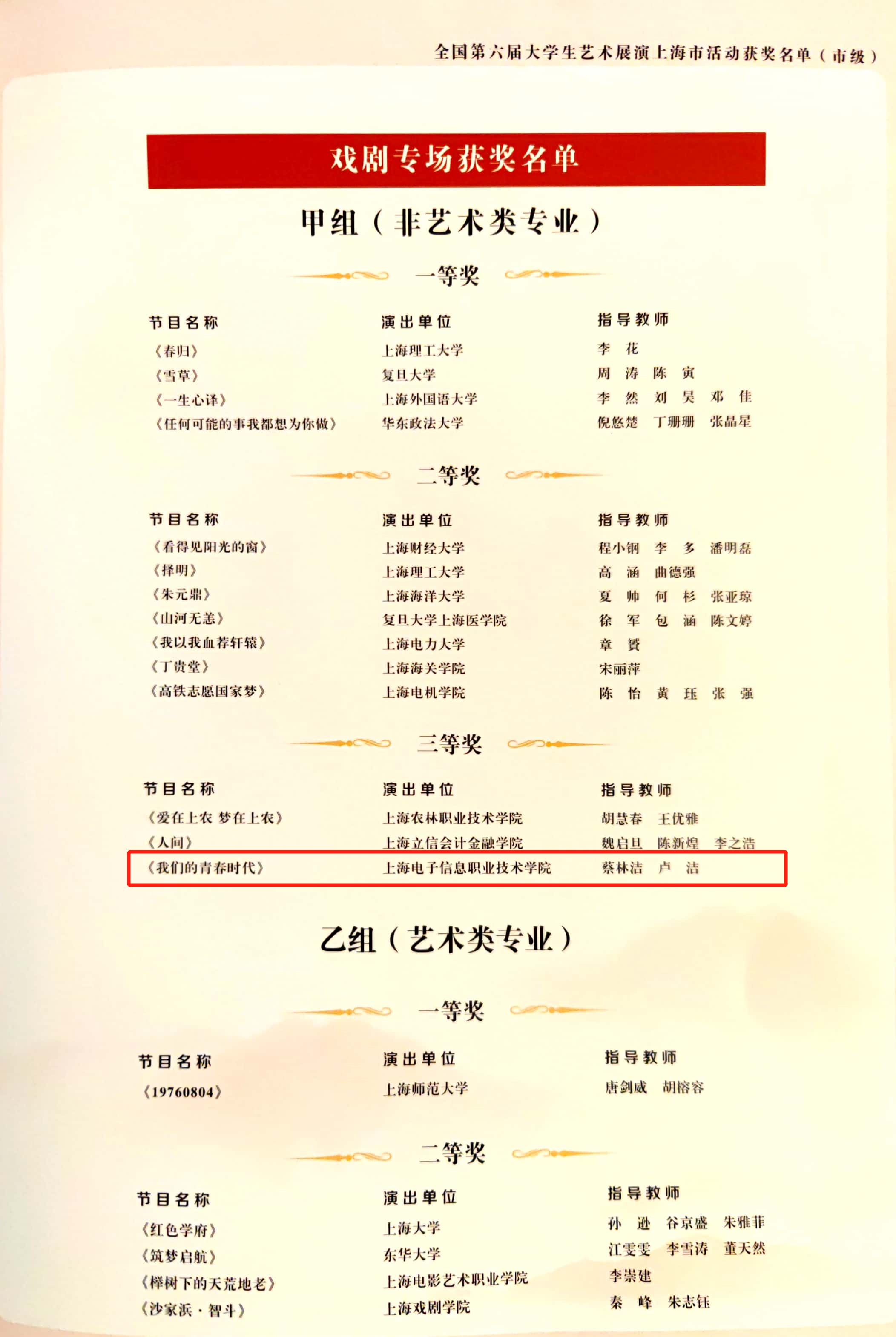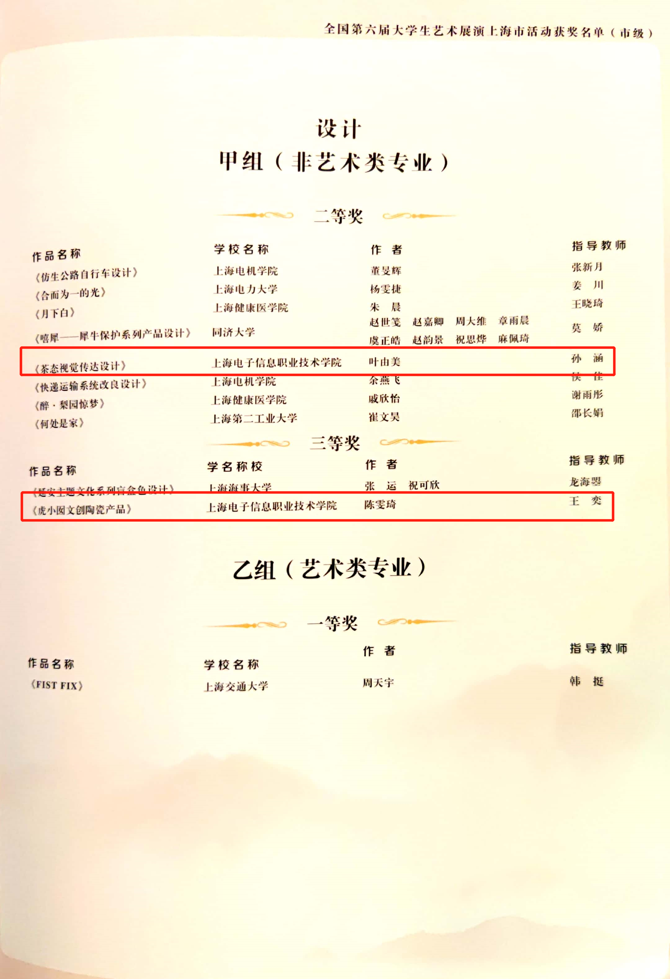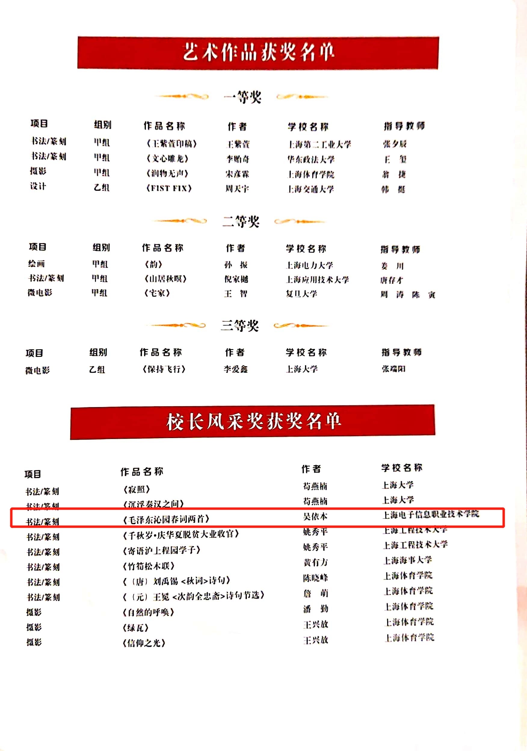 近日,上海市教育委员会公布了第六届全国大学生艺术展演上海赛区活动获奖名单。365官网共荣获11个奖项,在上海高职院校中名列前茅。其中,获得高校优秀组织奖1个、“校长风采奖”1个、其他艺术表演及设计类二等奖2个、三等奖7个。