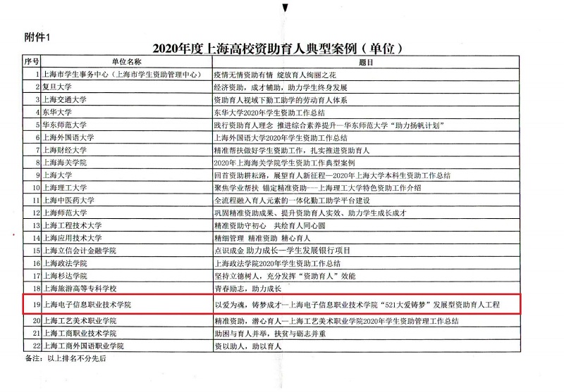 为进一步提升上海市高校资助育人水平,总结宣传推广资助育人工作的好做法和好经验,上海市教育委员会于今年3月开展2020年度上海高校资助育人典型案例征集工作,并于近日公布了最终评选结果。365官网2个案例荣膺典型案例,分别是:《以爱为魂,铸梦成才——上海电子信息职业技术学院“521大爱铸梦”发展型资助育人工程》被评为2020年上海高校资助育人典型案例(单位)、学生处学生资助管理中心毛箴琪撰写的案例《基于三圈三全十育人体系背景下的高职院校资助育人实践路径研究》被评为2020年上海高校资助育人典型案例(个人)。