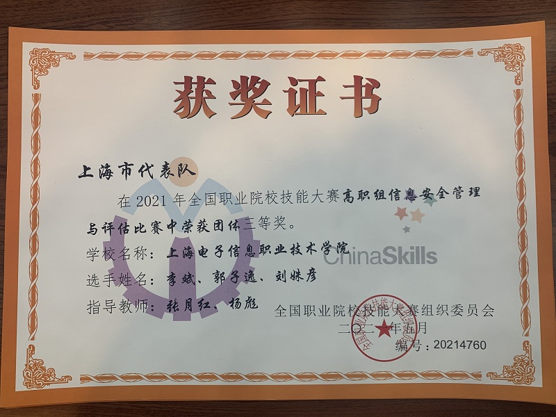 6月19日至20日,全国职业院校技能大赛(高职组)“信息安全管理与评估”赛项在山东聊城职业技术学院举办。我院2019级信息安全与管理专业李斌、郭子逸、刘姝彦同学,在张月红、杨彪老师指导下,与来自全国各省、市、自治区的其他30支代表队展开激烈的角逐,最终凭借过硬的素质、良好的技能,层层闯关,斩获大赛三等奖。