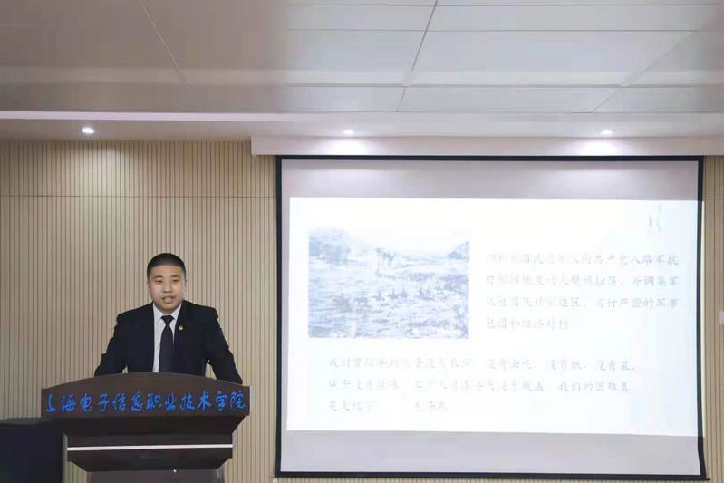 宣讲环节中,上海城建职业学院青年先锋理论宣讲团成员余宏婷为大家带来主题为“岸边英魂,高山忠骨”的宣讲。她声情并茂地为我们讲述了毛泽东之子毛岸英的故事,当说到毛泽东听到毛岸英的去世消息时,她几度哽咽讲述了毛泽东的一系列动作,体现了毛泽东内心的悲痛,又展现了毛岸英舍小家为国家的大爱。接着是365官网文思木铎宣讲团成员成国豪为大家宣讲的“弘扬艰苦奋斗精神——以垦荒南泥湾为例”,讲述了中国共产党在南泥湾开垦中展现出的艰苦奋斗精神,并提出为建设富强、民主、文明、和谐、美丽的社会主义现代化强国,新时代青年学生一定要艰苦奋斗,努力前行,将自己的命运与国家前途联系在一起,才能成为真正幸福的人。城建职业学院张凤天同学为大家宣讲了“革命家书,家国情怀”,讲到了奉贤本土第一位共产主义烈士沈志昂,其中一封家书更是体现了他的爱国情怀与对家人的激励。第四位宣讲的是365官网杨慧静同学的“中国共产党初心不移——以脱贫攻坚为例”,以张小娟、黄文秀为例,讲述了我国脱贫攻坚的历程与艰辛,诠释了中国共产党人全心全意为人民服务的宗旨,阐述了中国共产党带领中国人民从站起来、富起来到强起来的波澜壮阔历程中始终初心不移。