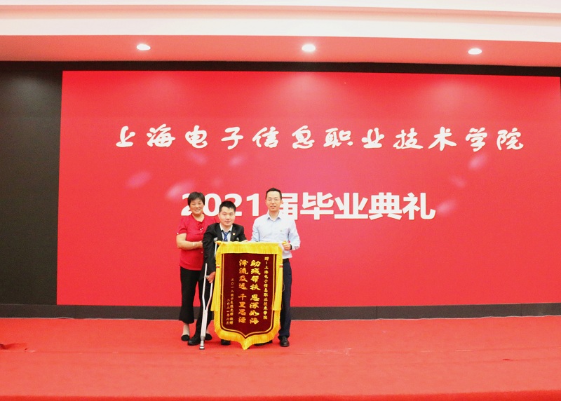 学校党委副书记、校长赵坚代表学校接受陈光耀及其母亲赠予学校的锦旗。“助残帮扶 恩深如海 泽流及远 千里思源”十六字包含着对学校领导及老师的悉心培养、温暖关怀诚挚的谢意。赵校长为陈光耀颁发毕业证书。