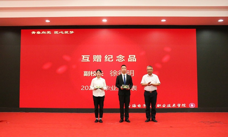 学校副校长徐德明代表学校向毕业生赠送学校用心设计定制的纪念品——一套校训石颗粒积木,这些印有校训“尚德修能 知行合一”的积木,承载着电子信息学院对每位毕业生的祝福和伴随,印刻着大学时光的记忆。