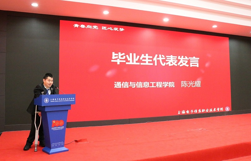 “2019上海大学生年度人物”获得者、通信与信息工程学院陈光耀代表全体毕业生发言,他回顾三年在学校的求学时光,分享了自己的收获与成长,表达对师长悉心培养的感谢和对母校的祝愿。他说:“虽然我身体残疾,但未曾放弃,从来没有向命运低头。今后,我将进一步要求和管理自己,强化自律意识,提高进取精神,实现自己的人生价值。”