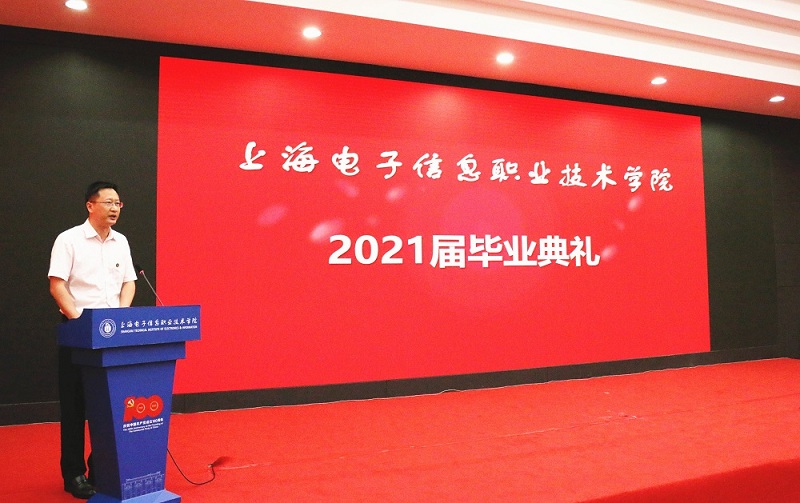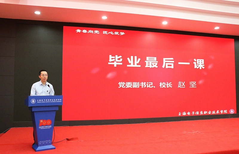 学校党委副书记、校长赵坚代表学校致毕业辞,为毕业生讲授“最后一课”。他说道,三年来,同学们一同见证了学校的快速发展:学校建成了国家优质专科高等职业院校,开启了上海“双一流”专科高等职业教育建设,建成上海市依法治校示范校,获评“2018年、2019年亚太职业院校影响力50强”荣誉。学校创新了五年一贯制人才培养模式,成为首批“1+X”证书制度试点院校。学校积极响应国家“一带一路”倡议,牵头的上海电子信息职业教育集团成为首批评价优秀职教集团,以此为基础成立的长三角电子信息职业教育集团被列入中共中央、国务院印发的《长江三角洲区域一体化发展规划纲要》中。三年间,同学们铭记“尚德修能、知行合一”的校训,弘扬“自强不息、开拓创新”的学校精神,积极学习,努力实践,职业能力不断提升,综合素养得以养成。特别是在过去的不平凡的一年,面对突如其来的新冠肺炎疫情,全体电子信息学院人积极投身抗“疫”,同学们的行动彰显了青年一代抗“疫”的坚强力量,展现出对国家和人民的责任担当,让学校倍感骄傲和自豪。临别之际,赵校长勉励毕业生们:要志存高远,永葆进取之心,用更广博的知识、以更坚定的志向面对更复杂的任务和更艰巨的挑战;要敢于担当,坚守责任之心,用善的心去影响社会,用担当的心去奉献社会,用刚毅坚卓的品格成就人生;要懂得感恩,拥有颗宽容之心,带着感恩的心去生活,即使在困境中也能发现美、欣赏美、创造美,真正感受到生活的美。