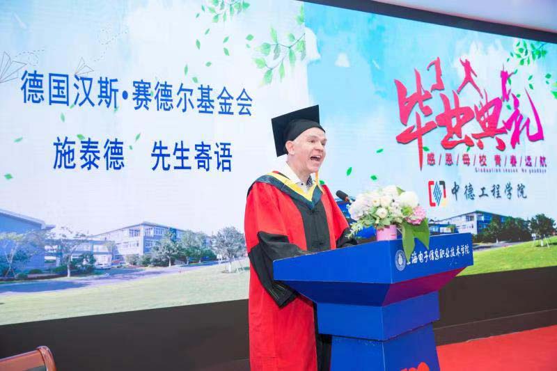德国汉斯•赛德尔基金会上海代表处首席代表、中德合作项目负责人施泰德先生寄语毕业学子,希望能始终葆有终身学习的态度,不懈努力,勇于担负起时代的使命,成为对社会有贡献的人。