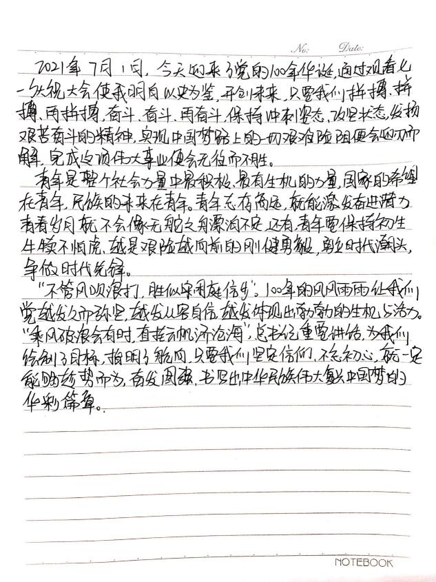 7月1日上午8时,庆祝中国共产党成立100周年大会上在北京天安门广场隆重举行,中共中央总书记、国家主席、中央军委主席习近平发表重要讲话。全体青马班学员收看并展开热议。百名学员发自肺腑地抒写了百篇感想:“党的队伍里始终活跃着胸怀崇高理想、充满奋斗激情的青年人。我们是祖国的未来和期望,让我们在党的领导和鼓励下勇敢的担当,以更强的历史责任感和使命感,不负党对我们年轻人的无限厚望,让青春与党同行!”青马班学员将把七一讲话牢记于心,将所学所思融入到今后的团学工作中,更加努力为中国梦的目标贡献自己的力量!在“对话历史,致敬青春”活动中,100位青马学员分成10个小组,分别学习了《学党史、知党情、跟党走》一书中的10个章节,小组成员们聚在一起,针对书中的内容展开热烈讨论,谈新时代青年担当、谈党史学习体会,还从自身专业角度出发,结合百年党史,分享对“学党史、强信念、跟党走”的理解。