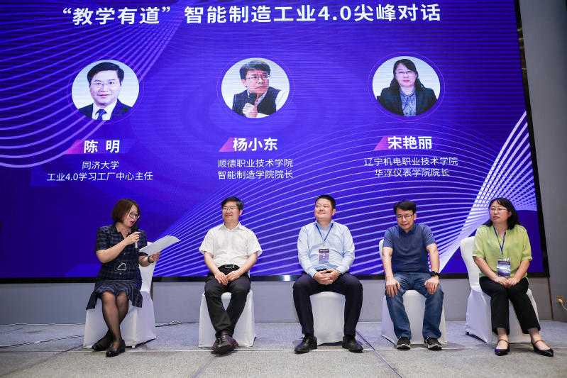 全国人工智能职教集团工业4.0专业委员会主任朱咏梅、同济大学工业4.0学习工厂中心主任陈明、西门子教育合作部门经理范骏、顺德职业技术学院智能制造学院院长杨小东,以及辽宁机电职业技术学院华孚仪表学院院长宋艳丽四位嘉宾开展教学有道“智能制造工业4.0”尖峰论坛。嘉宾从高校、产业及职业院校等几个维度进行深入交流和讨论。