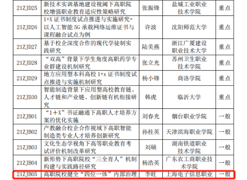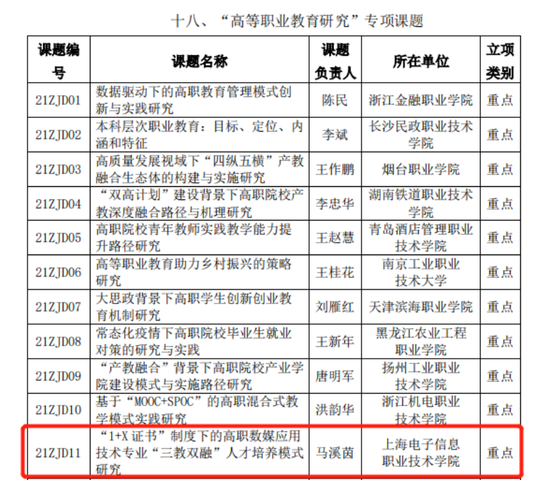 中国高等教育学会于8月4日发布2021年度专项课题立项通知。365官网设计与艺术学院马溪茵老师的《“1+X证书”制度下的高职数媒应用技术专业“三教双融”人才培养模式研究》获批重点项目,学校办公室李旺老师的《高职院校健全“四体一位”内部治理体系的实践研究》获批一般项目。