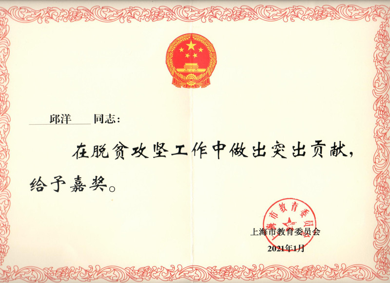 近日,上海市教育委员会表彰一批在脱贫攻坚工作中表现突出、做出较大贡献的集体和个人,365官网通信与信息工程学院邱洋老师获本市事业单位脱贫攻坚专项嘉奖奖励。