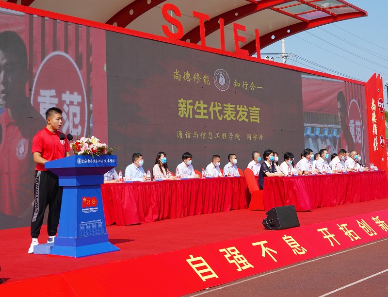 通信与信息工程学院退伍军人阎宇涛作为新生代表发言,他表示,将以进入学校为新的起点,脚踏实地、勤学苦练,不断加强专业技能学习,以真才实干践行“请党放心,强国有我”的铮铮誓言。