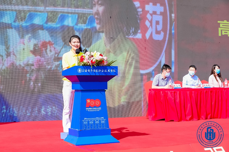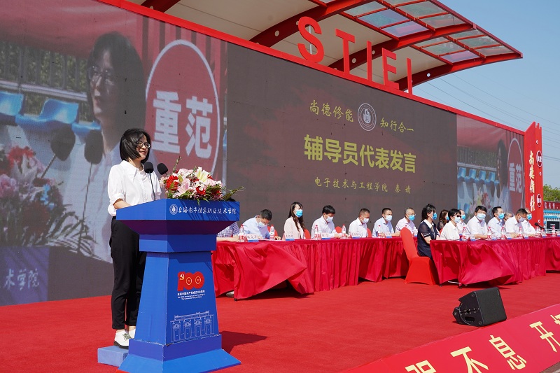 电子技术与工程学院秦婧作为辅导员代表发言,她勉励新生:要勤学善思,找准定位;要磨砺技能,成才报国;要热爱劳动,奉献社会;要立志明德,肩负使命。